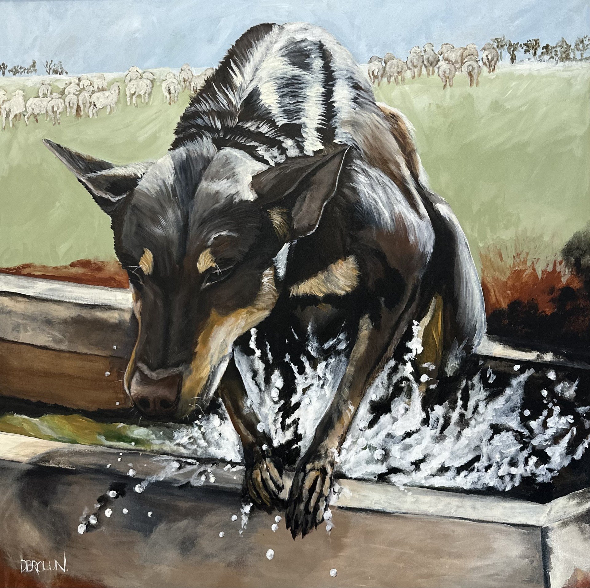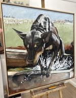 Kelpie in trough - 20 x 40" Original Acrylic on Canvas. Float Framed in Natural Oak